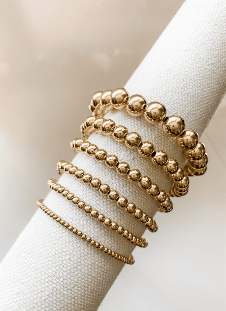 Made with 14K Gold-Filled beads and a durable elastic for a comfortable stretch to roll on and off your wrist OR choose to style up with our clasp finish and findings